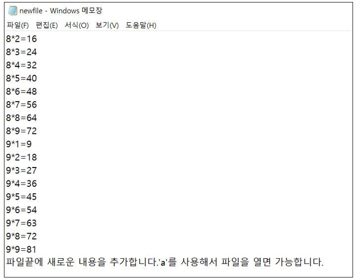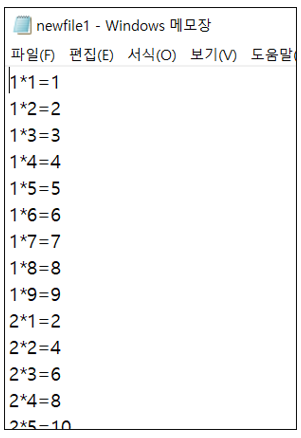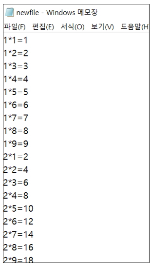C:\Users\USER\Documents\라는 경로에 newfile이라는 이름의 구구단이 입력된 파일 생성하기