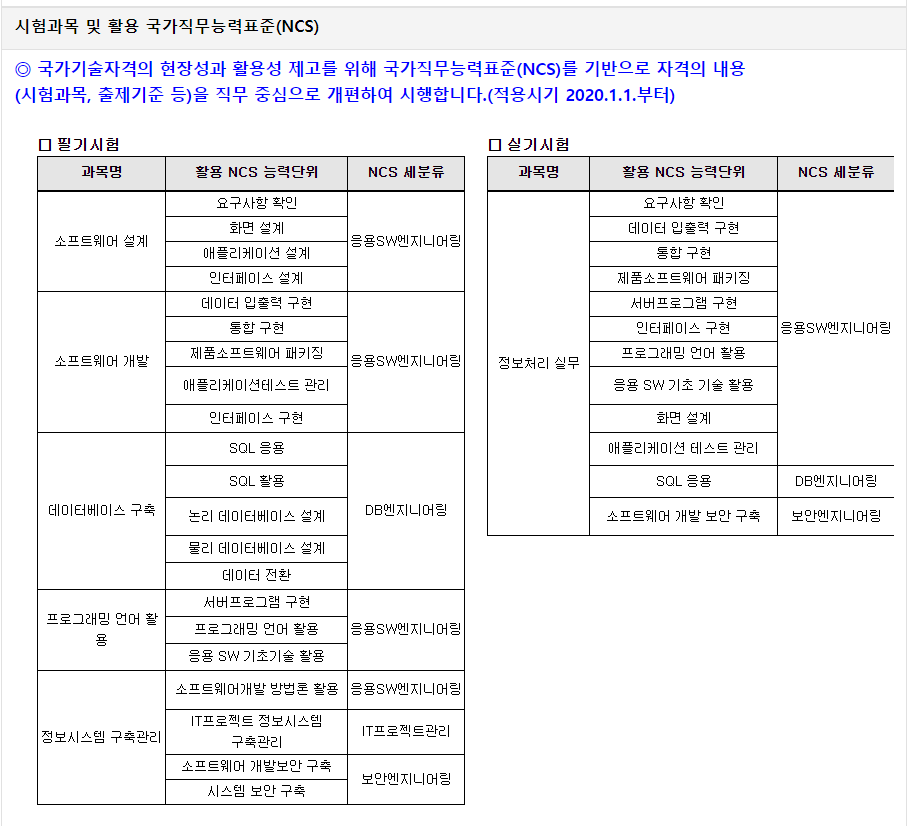 시험은 국가기술 자격법 시행규칙 개정(2018. 6. 22.)에 따라 NCS에 맞춰 2020년부터 시험 과목이 대폭 개편되었다.