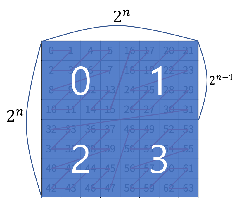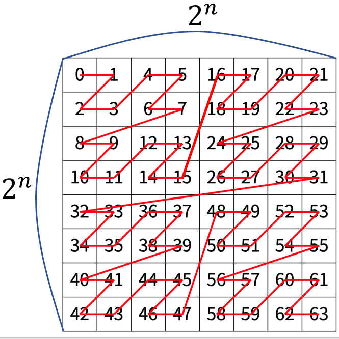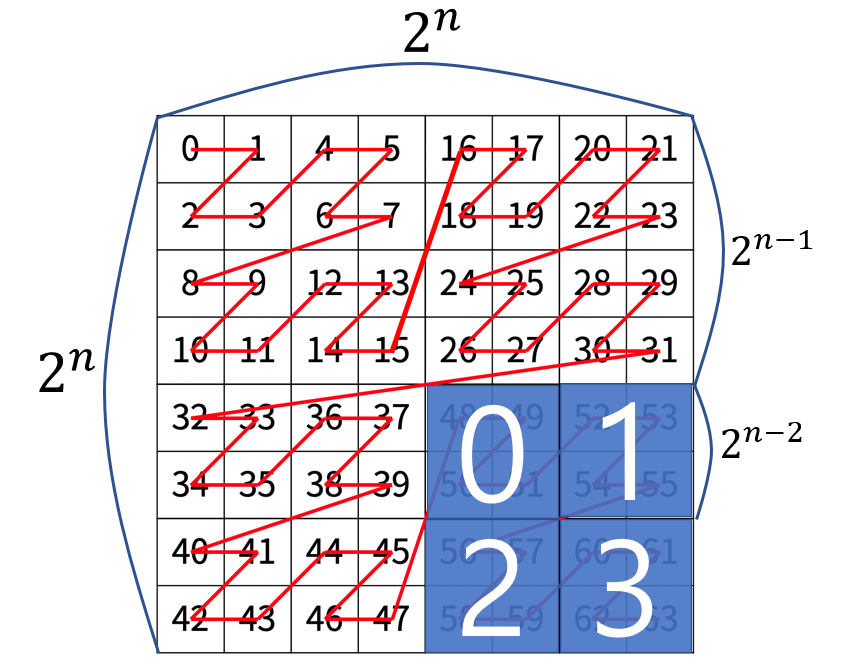 2^N X 2^N인 2차원 배열을 Z 모양으로 탐색한다.