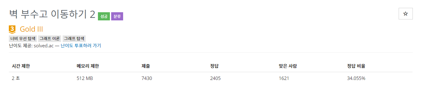이때 벽이라면 [이동할 행][이동할 열][지금까지 부순 벽의 수+1]를 지나갔는지 살펴본다.