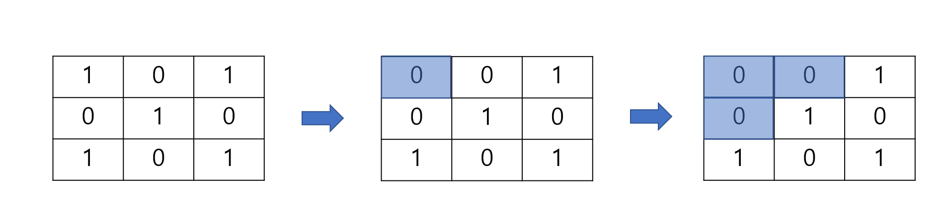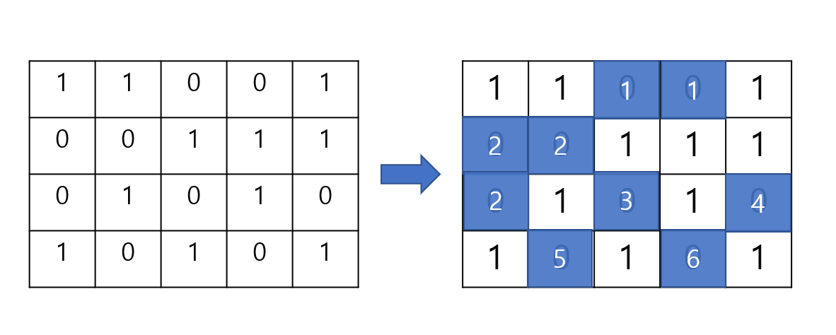 이를 해결하기 위해서 우선 분리 집합개념을 이용해 0으로 이루어진 그룹에 번호를 지정하고 해당 그룹의 개수를 센다.