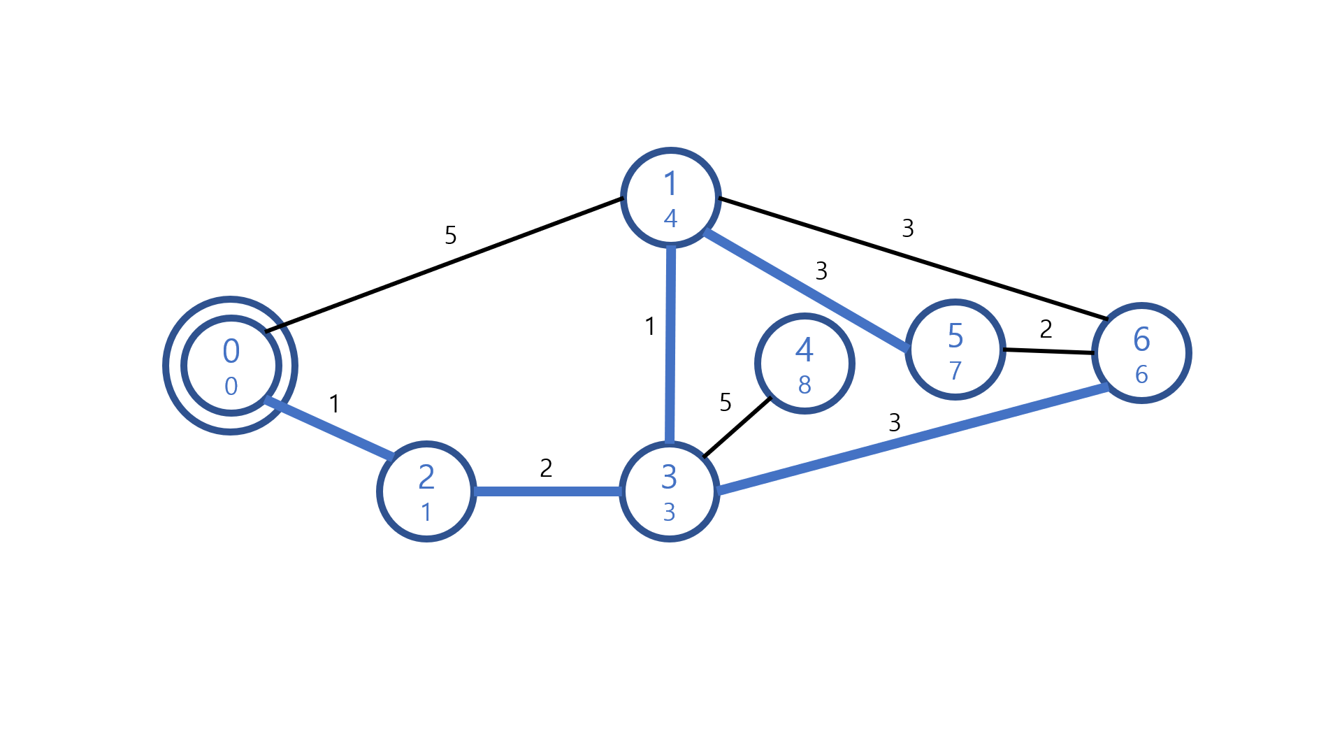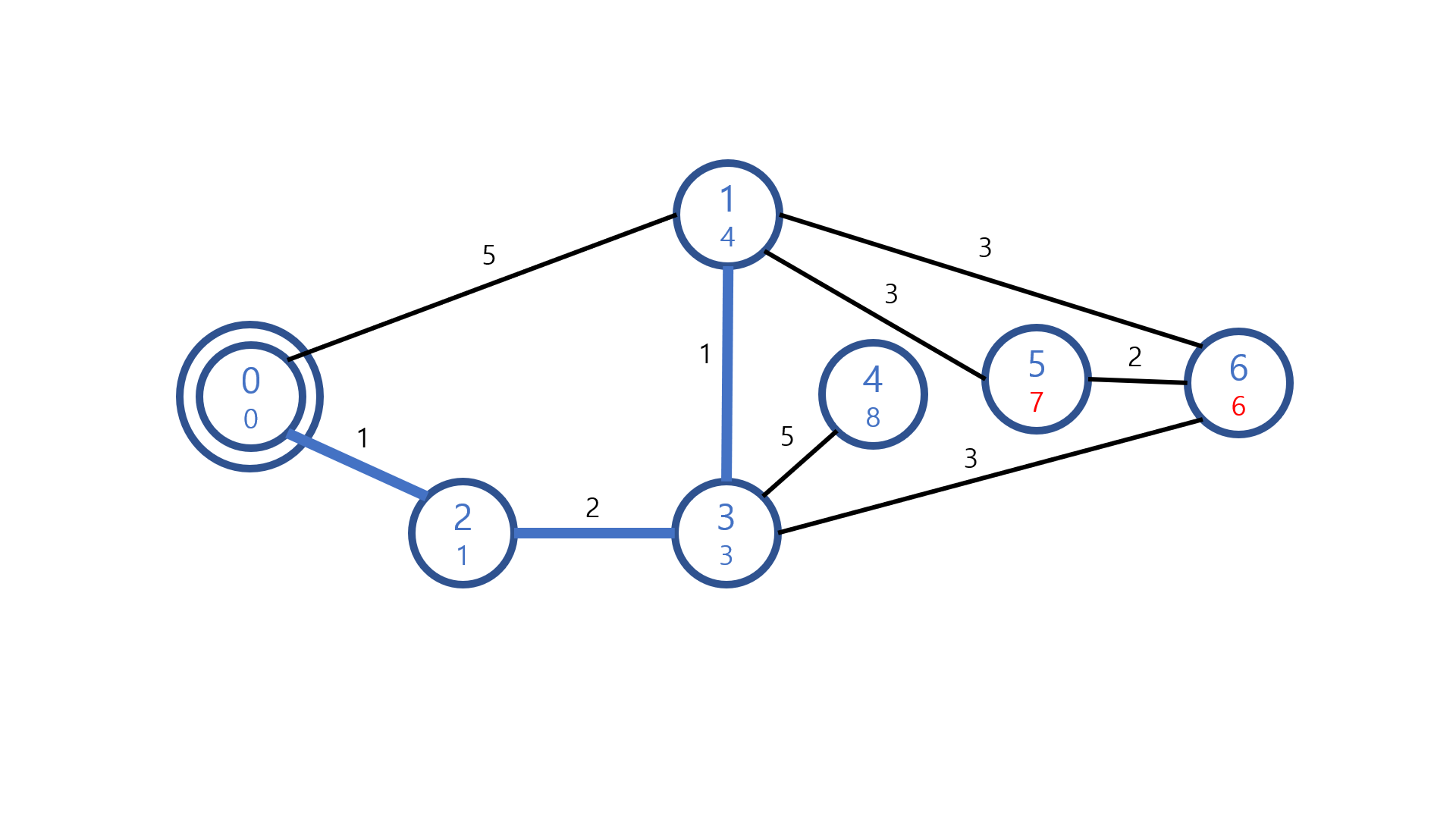우선순위 큐에 노드 인덱스와 간선 가중치의 값인(3, 3)를 추가한다.