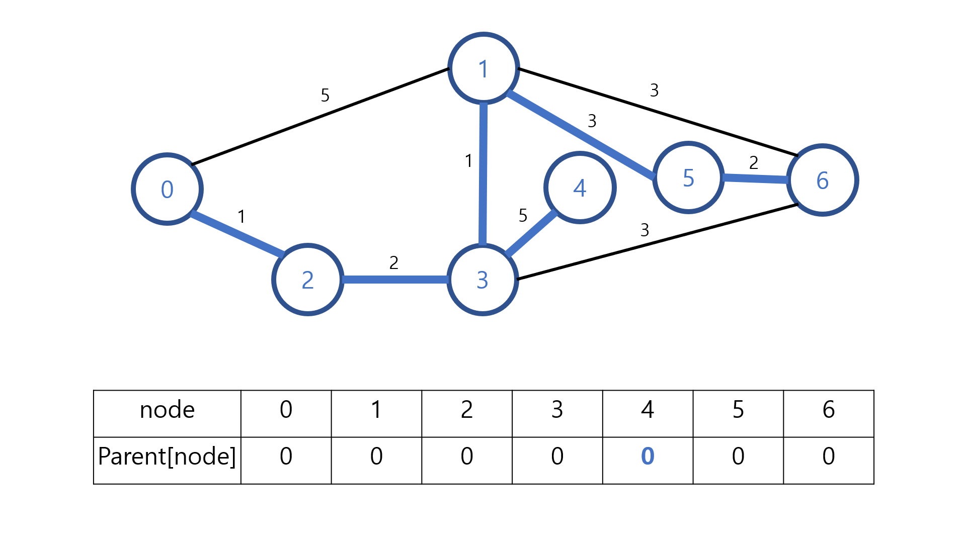 - 간선을 오름차순으로 정렬하고 이미 트리에 추가된 간선과 사이클을 이루지 않을 때 간선을 추가