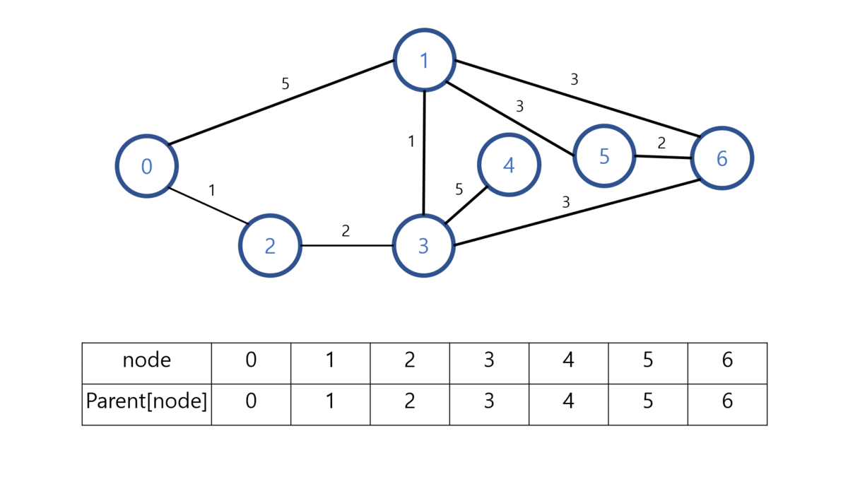for(int i = 0; i < v+1; i++) { // 부모 인덱스 담는 배열 자기 자신 노드로 초기화