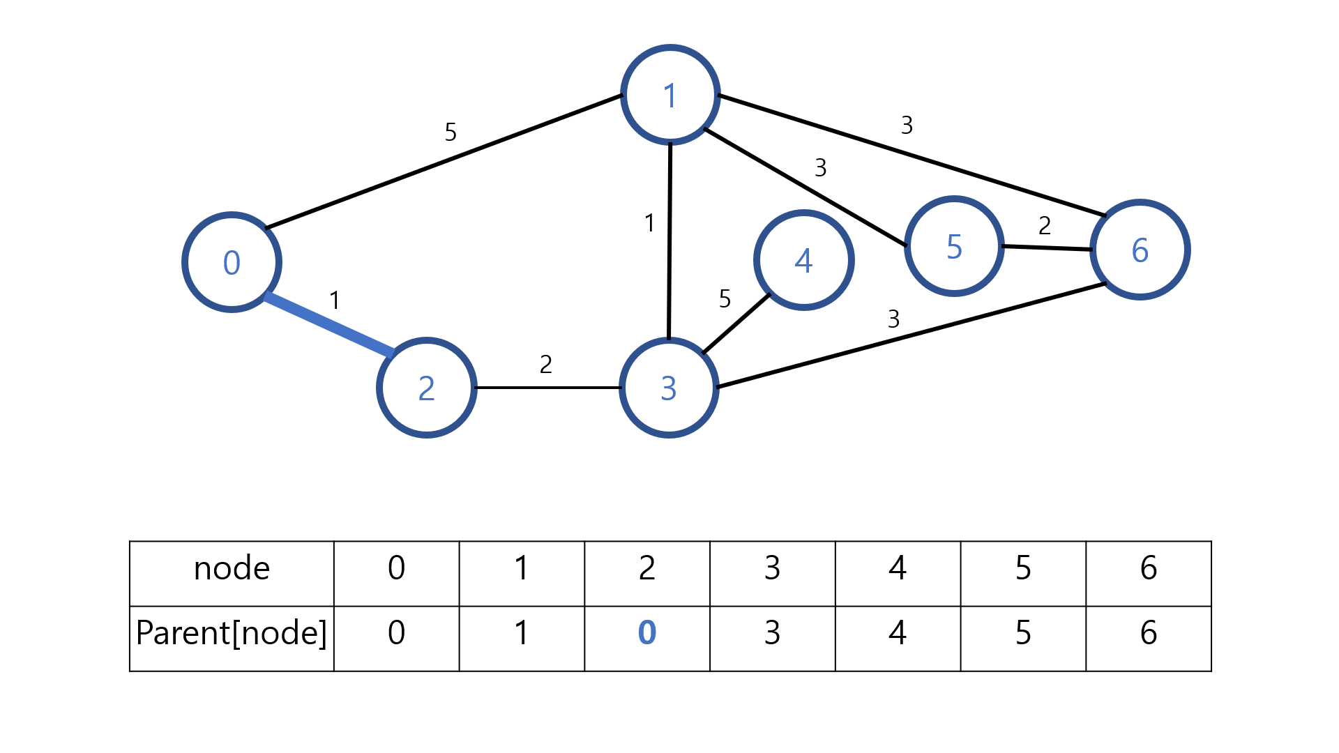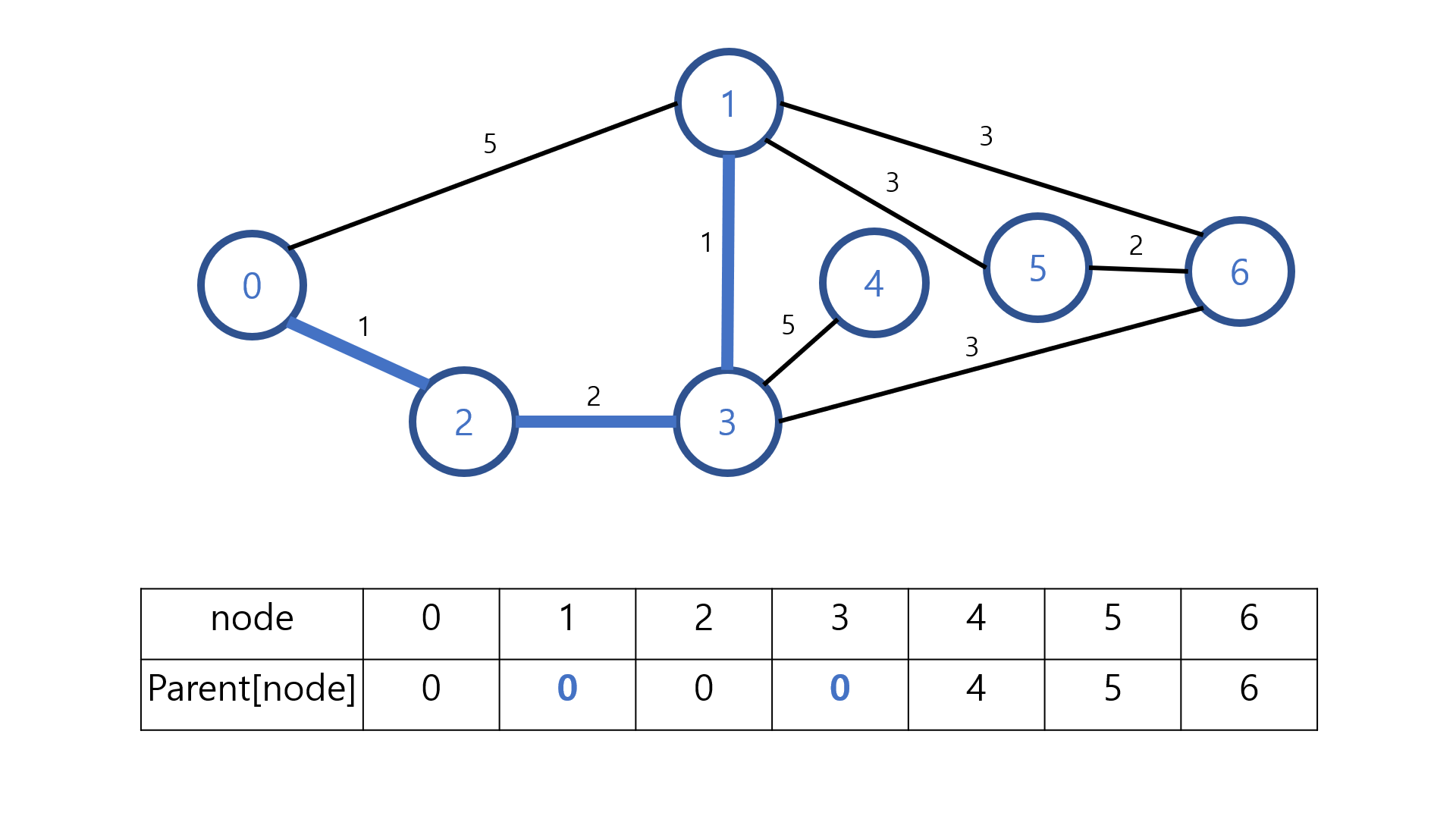 따라서 두 노드의 부모를 더 작은 값의 부모의 값으로 변경한다.