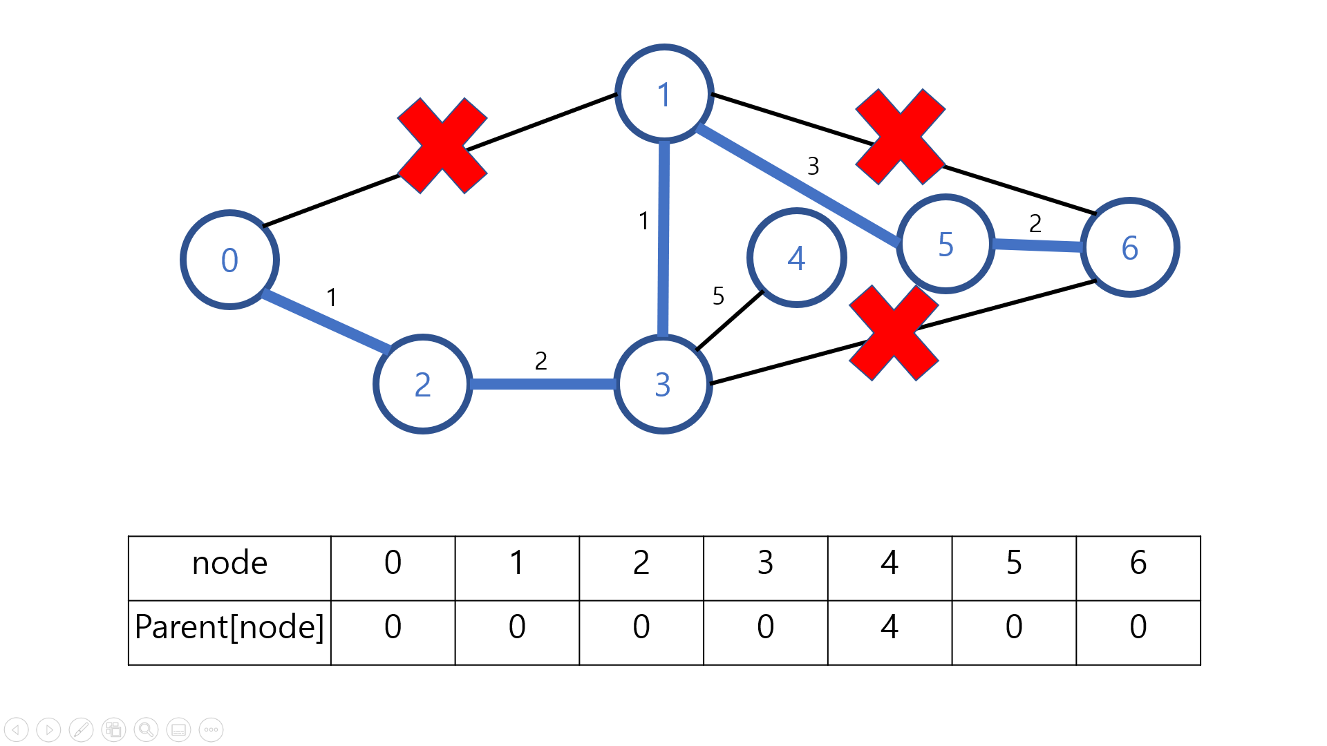 사이클을 이루기 때문에 해당 간선은 패스하게 된다.