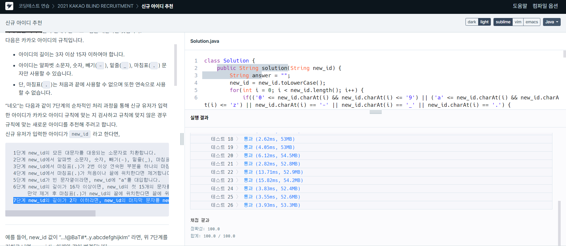 따라서 신규 유저가 입력한 new_id가 ...!@BaT#*..y.abcdefghijklm일 때, 네오의 프로그램이 추천하는 새로운 아이디는 bat.y.abcdefghi 입니다.