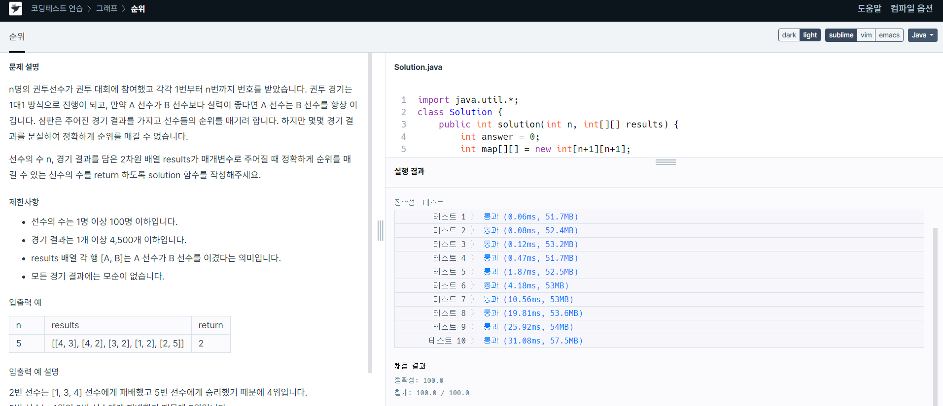 선수의 수 n, 경기 결과를 담은 2차원 배열 results가 매개변수로 주어질 때 정확하게 순위를 매길 수 있는 선수의 수를 return 하도록 solution 함수를 작성해주세요.