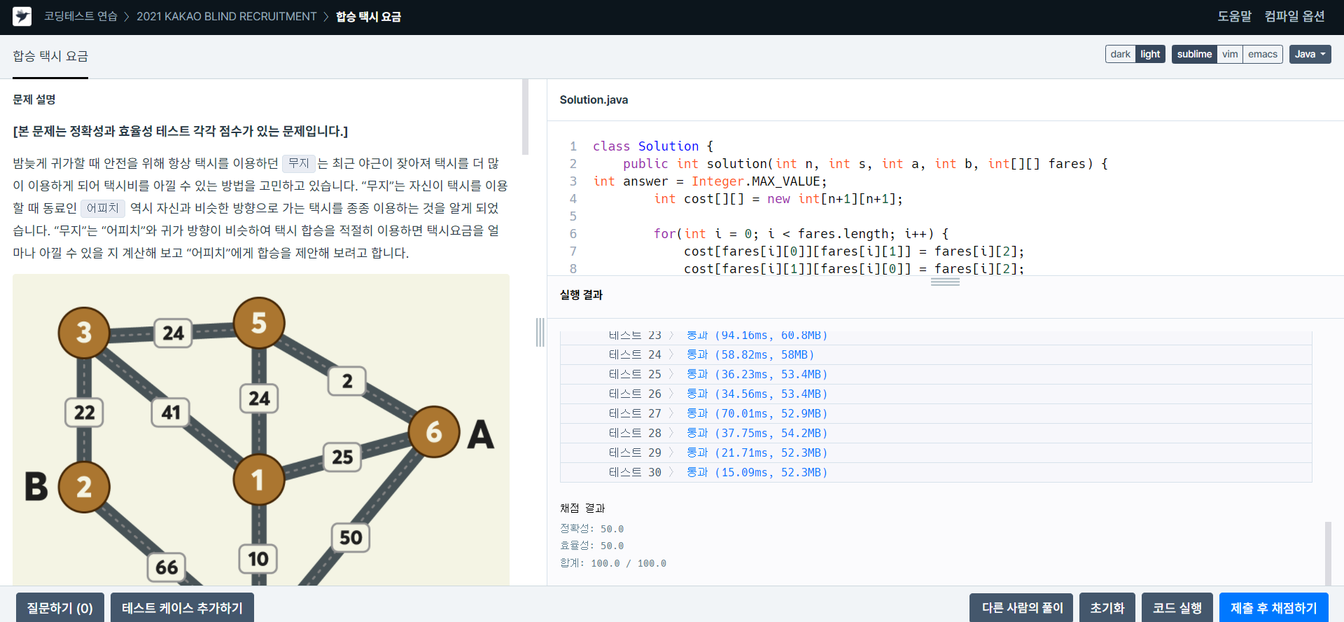 - fares 배열에 두 지점 간 예상 택시요금은 1개만 주어집니다. 즉, [c, d, f]가 있다면 [d, c, f]는 주어지지 않습니다.