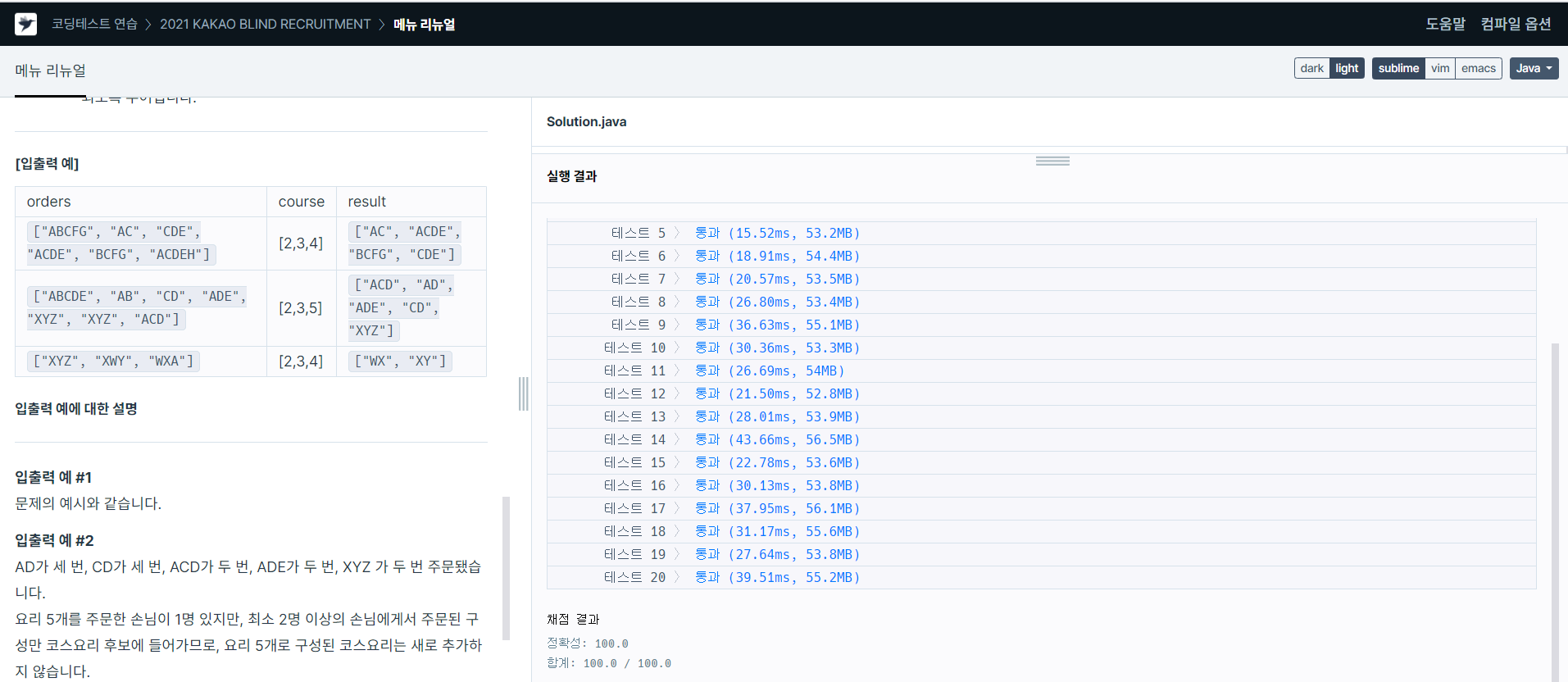 - 정답은 각 코스요리 메뉴의 구성을 문자열 형식으로 배열에 담아 사전 순으로 오름차순 정렬해서 return 해주세요.