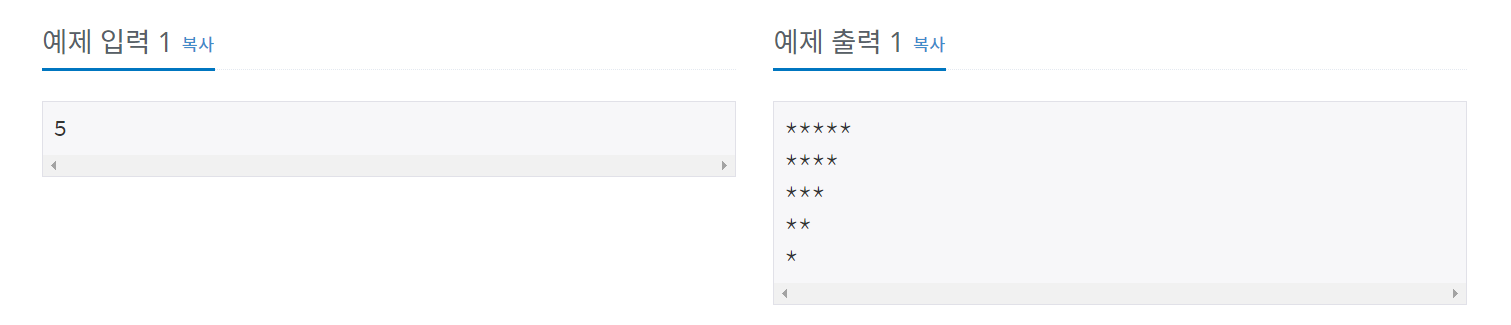 첫째 줄에는 별 N개, 둘째 줄에는 별 N-1개, ..., N번째 줄에는 별 1개를 찍는 문제