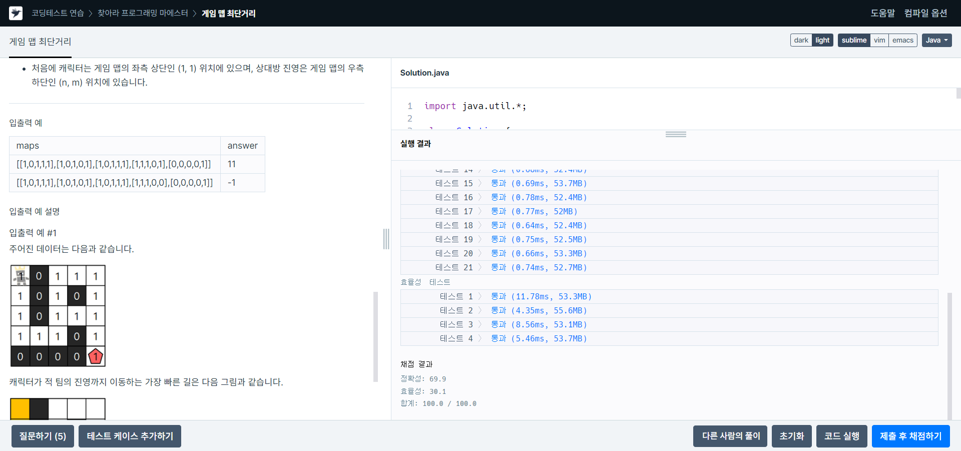 게임 맵의 상태 maps가 매개변수로 주어질 때, 캐릭터가 상대 팀 진영에 도착하기 위해서 지나가야 하는 칸의 개수의 최솟값을 return 하도록 solution 함수를 완성해주세요. 단, 상대 팀 진영에 도착할 수 없을 때는 -1을 return 해주세요.