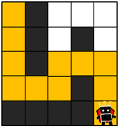 다음은 5 x 5 크기의 맵에, 당신의 캐릭터가 (행: 1, 열: 1) 위치에 있고, 상대 팀 진영은 (행: 5, 열: 5) 위치에 있는 경우의 예시입니다.