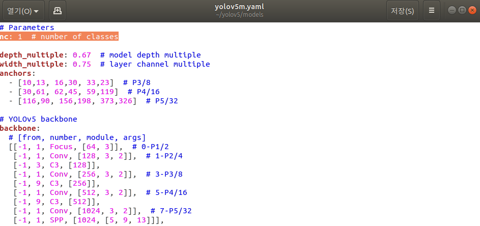 다음 4가지 중 원하는 모델의 yaml파일을 선택해 열어준 뒤 클래스 개수에 해당하는 nc의 값만 탐지할 객체에 수에 맞게 변경해 준다.