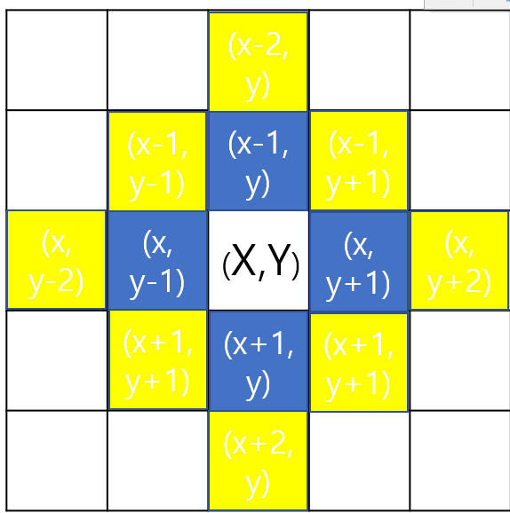 현재 좌표가 (x,y)일때 맨해튼의 거리가 1인 경우는 파란색 박스, 2인 경우는 노란색 박스로 볼 수 있다.