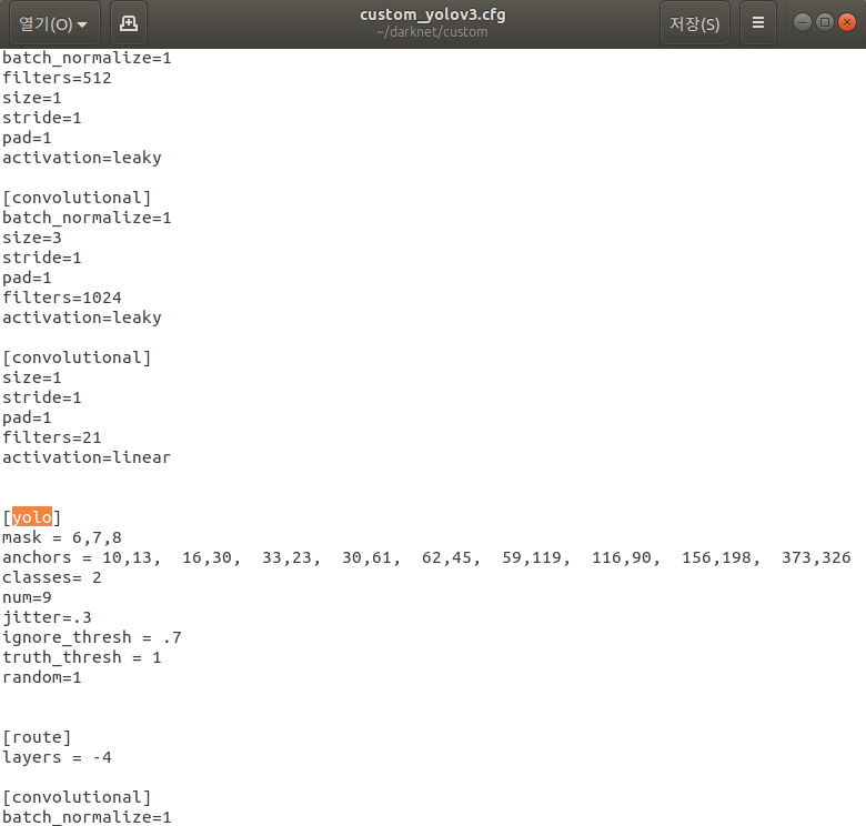 Ctrl + f를 이용해 "[yolo]"를 검색하면 3개가 나온다. 3개 모두 다음과 같이 설정을 바꿔야 한다.