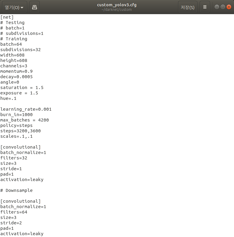 custom_yolov3.cfg 파일은 모델의 구조 및 train에 대한 설정이 들어있는 파일이다.