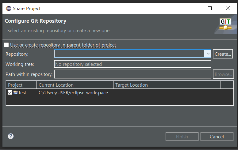 6. Share Project 에 Repository에 아까 clone한 Repository 선택후 Finish