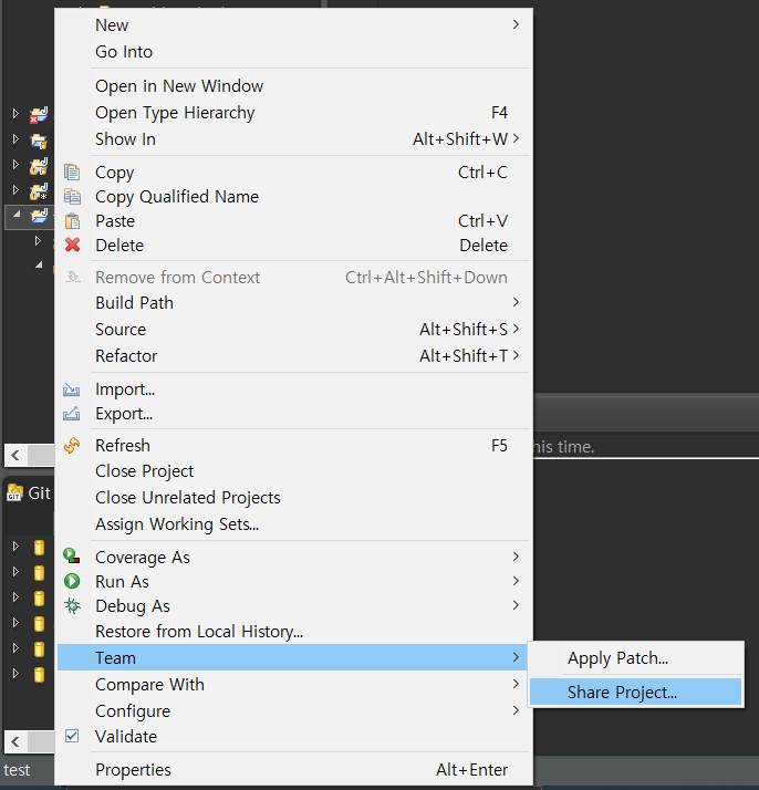 5. 깃허브와 연동되길 원하는 프로젝트에서 마우스 오른쪽 버튼 > Team > Share Project 클릭