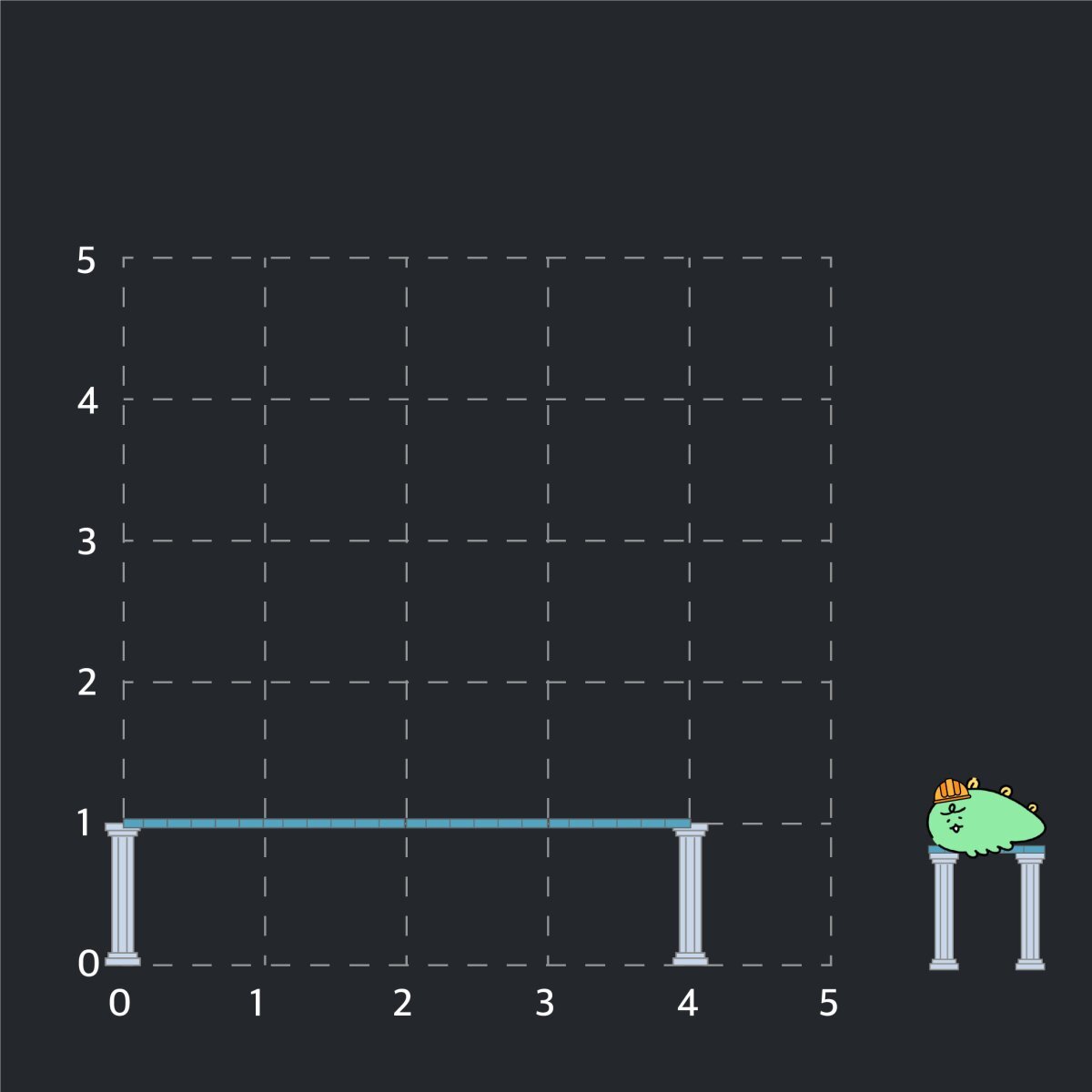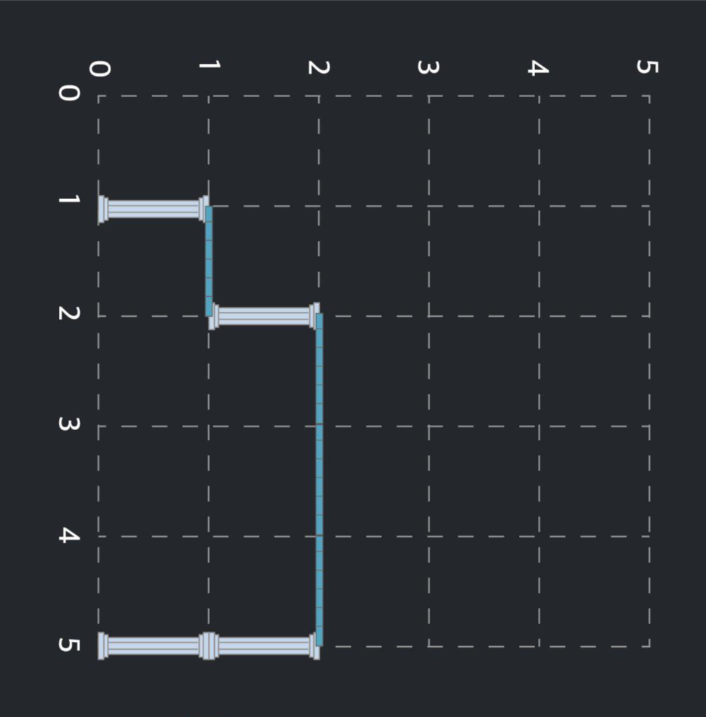 - (5, 0)에서 위쪽으로 기둥을 하나 설치 후, (5, 1)에서 위쪽으로 기둥을 하나 더 설치합니다.