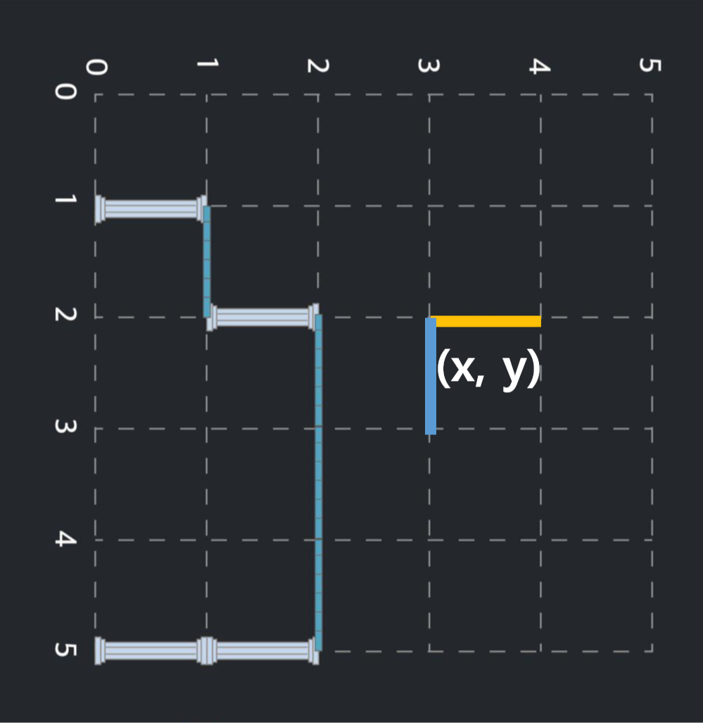 현재 좌표를 (x, y)라 했을때 해당 기둥과 보는 다음과 같은 막대기로 표시될 것이다.