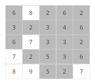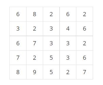 어떤 지역의 높이 정보는 행과 열의 크기가 각각 N인 2차원 배열 형태로 주어지며 배열의 각 원소는 해당 지점의 높이를 표시하는 자연수이다. 예를 들어, 다음은 N=5인 지역의 높이 정보이다.