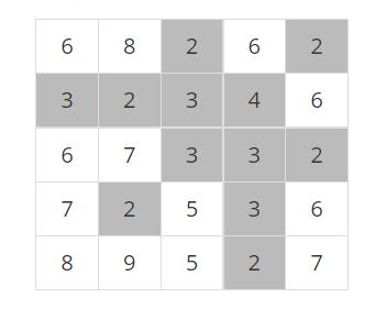 이제 위와 같은 지역에 많은 비가 내려서 높이가 4 이하인 모든 지점이 물에 잠겼다고 하자. 이 경우에 물에 잠기는 지점을 회색으로 표시하면 다음과 같다.
