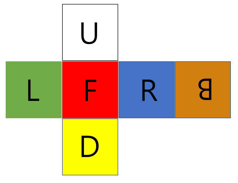 이 문제에서는 루빅스 큐브가 모두 풀린 상태에서 시작한다. 윗 면은 흰색, 아랫 면은 노란색, 앞 면은 빨간색, 뒷 면은 오렌지색, 왼쪽 면은 초록색, 오른쪽 면은 파란색이다.