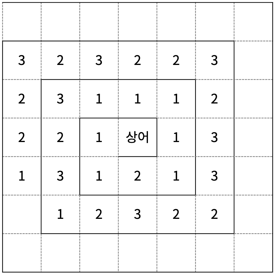 마법사 상어는 파이어볼, 토네이도, 파이어스톰, 물복사버그, 비바라기 마법을 할 수 있다. 오늘 새로 배운 마법은 블리자드이고, 크기가 N×N인 격자에서 연습하려고 한다. N은 항상 홀수이고, (r, c)는 격자의 r행 c열을 의미한다. 격자의 가장 왼쪽 윗 칸은 (1, 1)이고, 가장 오른쪽 아랫 칸은 (N, N)이며 마법사 상어는 ((N+1)/2, (N+1)/2)에 있다.