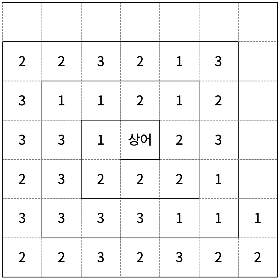 가장 처음에 상어가 있는 칸을 제외한 나머지 칸에는 구슬이 하나 들어갈 수 있다. 구슬은 1번 구슬, 2번 구슬, 3번 구슬이 있다. 같은 번호를 가진 구슬이 번호가 연속하는 칸에 있으면, 그 구슬을 연속하는 구슬이라고 한다. 다음은 N = 7인 경우 예시이다.