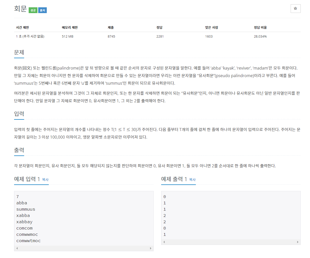 팰린드롬인지, 유사 팰린드롬인지, 아닌지를 판단하는 문제이다.