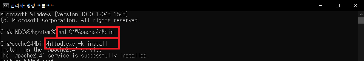"C:\Apache\bin" 경로로 이동한 뒤 "httpd.exe -k install" 명령어를 입력한다.