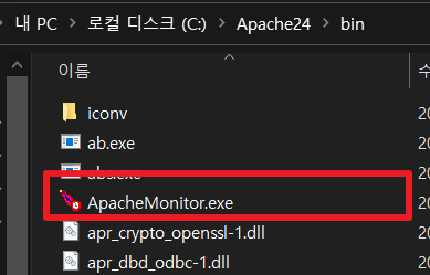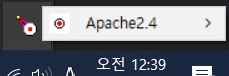 C:\Apache\bin폴더 아래 ApacheMonitor.exe을 실행하거나 작업 표시줄 아래 Apache 아이콘을 클릭해서 실행한다.