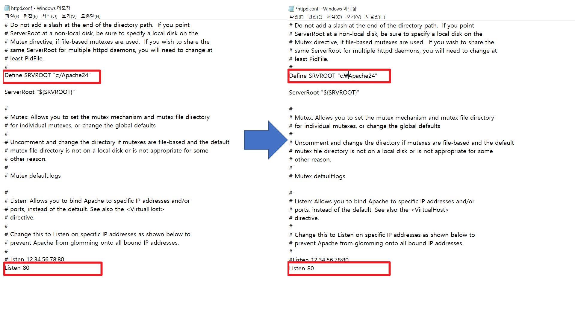 Sever Root의 경로 부분을 Apache24의 경로에 맞게 변경한다. (슬래시 -> 역슬래시)